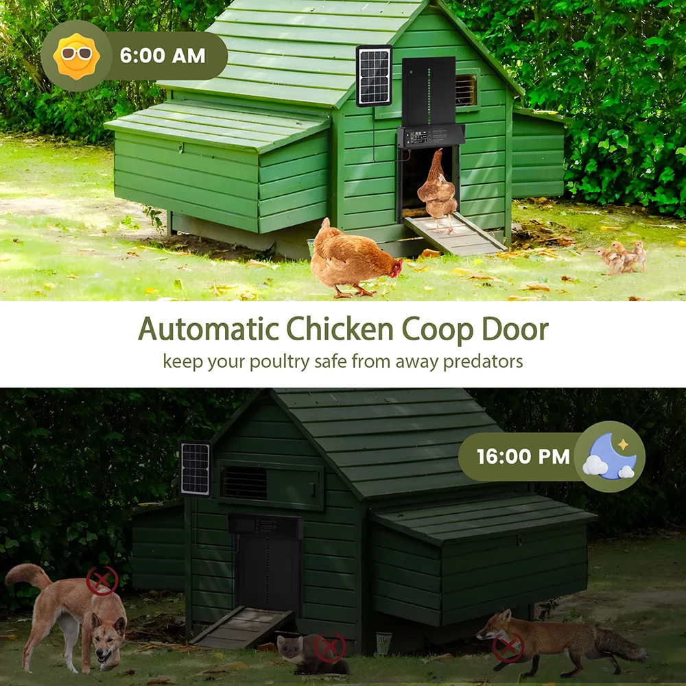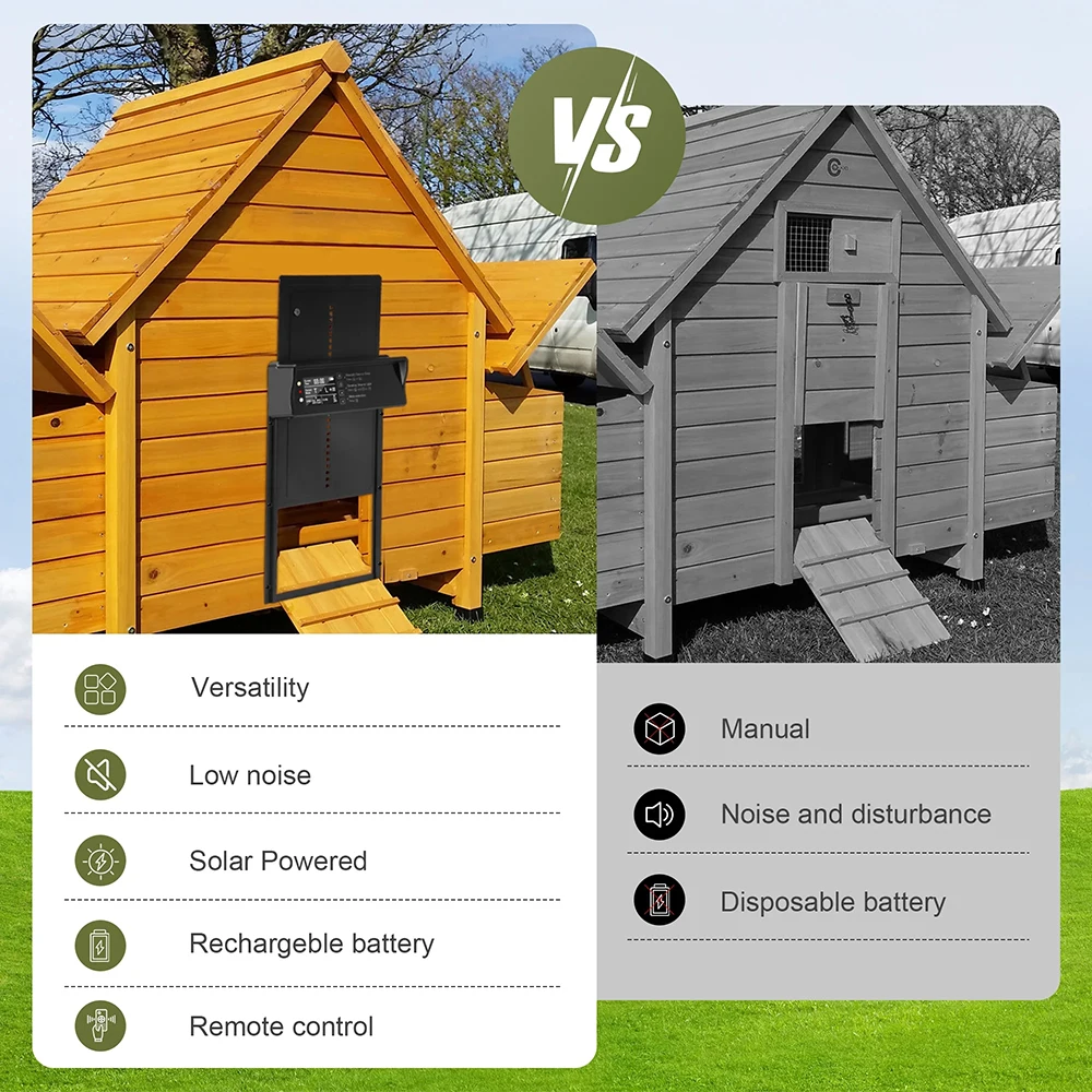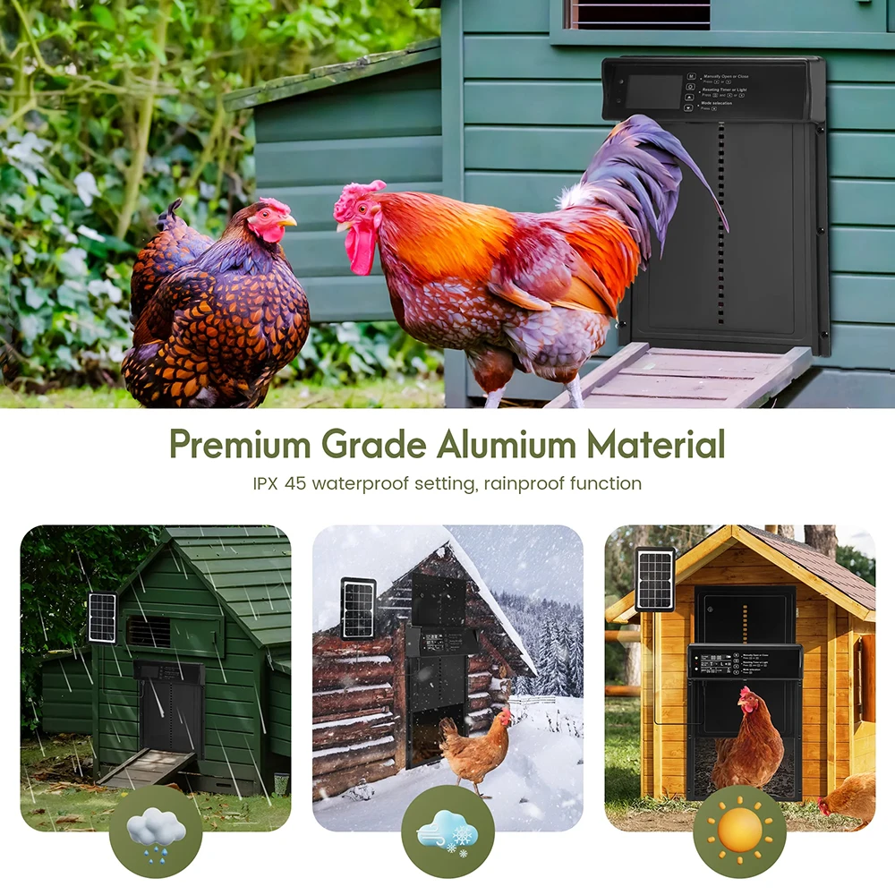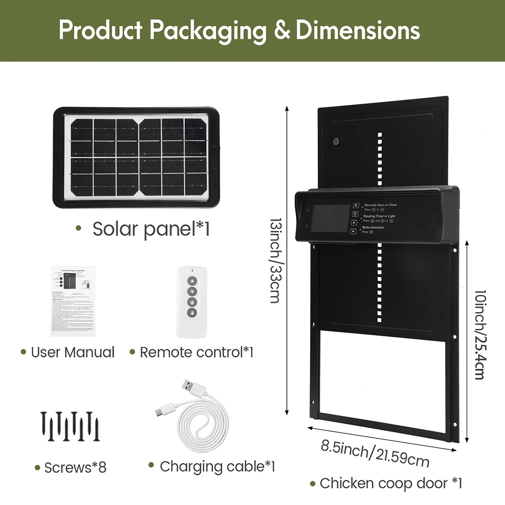 Porte automatique pour poulailler solaire – Écran LCD, capteur de lumière, télécommande.